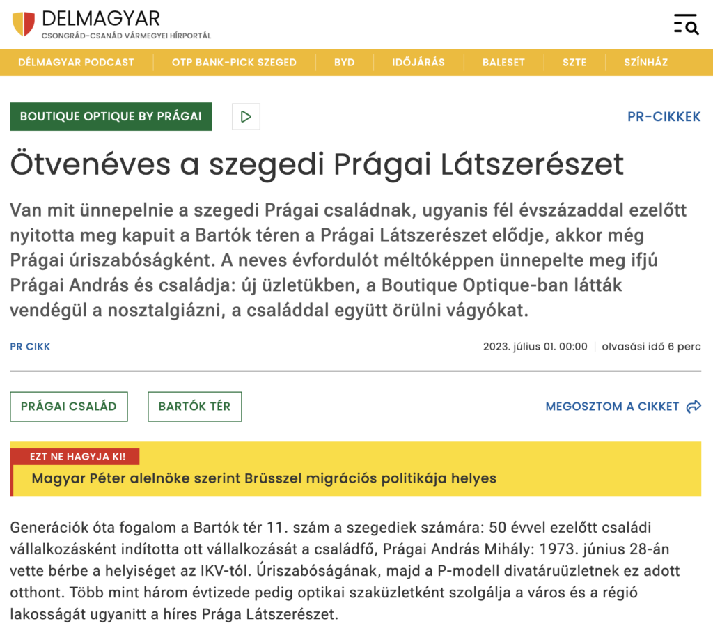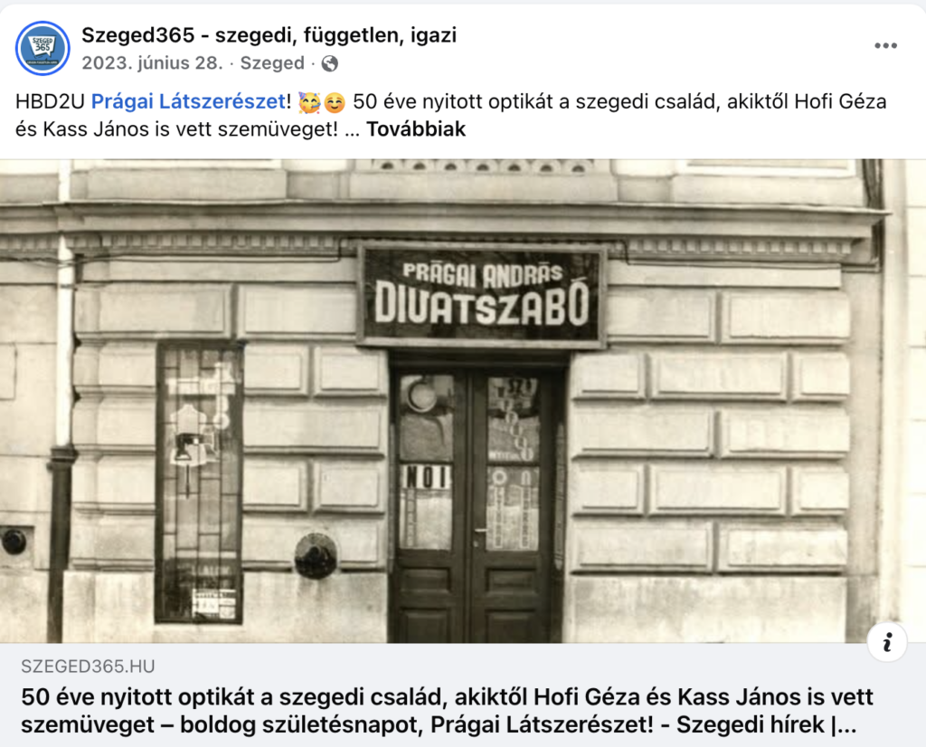 A családi vállalkozásunk 1973 óta üzemel, melyet a családfő Prágai András Mihály alapított Szegeden a Bartók Béla téren. Színvonalas optikai szolgáltatásunk lényeges jellemzője a megbízhatóság, a naprakész szakmai felkészültség és pontosság. A vállalkozásunk sikerességét az állandó fejlesztéseknek és a profil folyamatos bővítésének köszönhetjük.